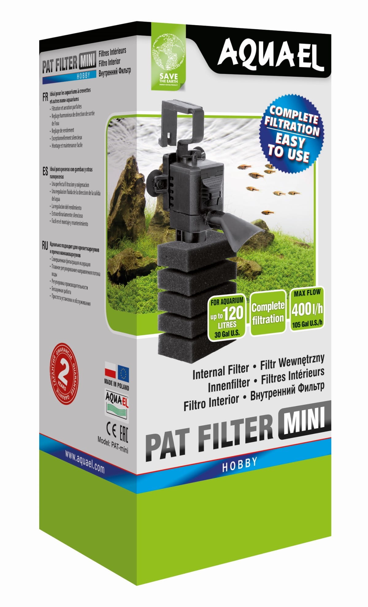 AQUAEL PAT MINI z dodatkową gąbką – miniaturowy filtr turbinowy PAT MINI przeznaczony do małych akwariów słodkowodnych. Urządzenie to składa się z maleńkiej głowicy oraz starannie selekcjonowanej gąbki filtracyjnej. Dzięki zastosowaniu innowacyjnych rozwiązań konstrukcyjnych głowica posiada wydajność maksymalną aż 400 l/h, czyli tyle, ile typowy średniej wielkości turbinowy filtr akwariowy. A wszystko to przy poborze energii nie większym niż 4 W.