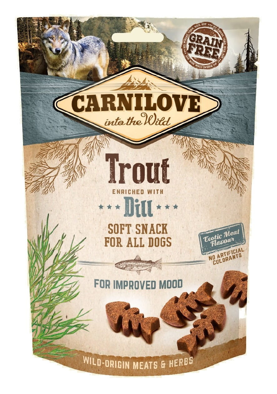 Carnilove Semi Moist Snack Trout with Dill jest to miękka, pyszna przekąska z pstrągiem dla wszystkich psów. W skład wchodzi koper, który wspomaga trawienie.
