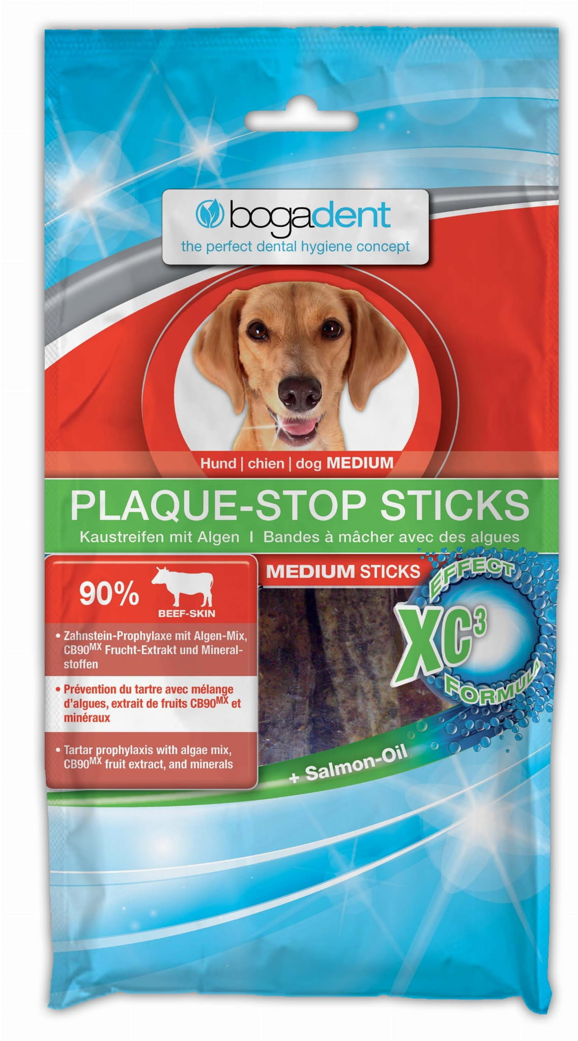Przysmaki z naturalnych pasów skóry wołowej wyprodukowane z alg i olei łososiowych. Nowo opracowana Formuła - XC3 - Efekt służy do zapobiegania powstawania płytki nazębnej i kamienia nazębnego. Formuła jest nakładana bezpośrednio na pasy surowej skóry w delikatnym i innowacyjnym procesie produkcji. Rezultatem jest smaczny i funkcjonalny przysmak do żucia o nazwie bogadent® PLAQUE-STOP STICKS, który aktywnie zapobiega tworzeniu się płytki nazębnej i kamienia nazębnego.