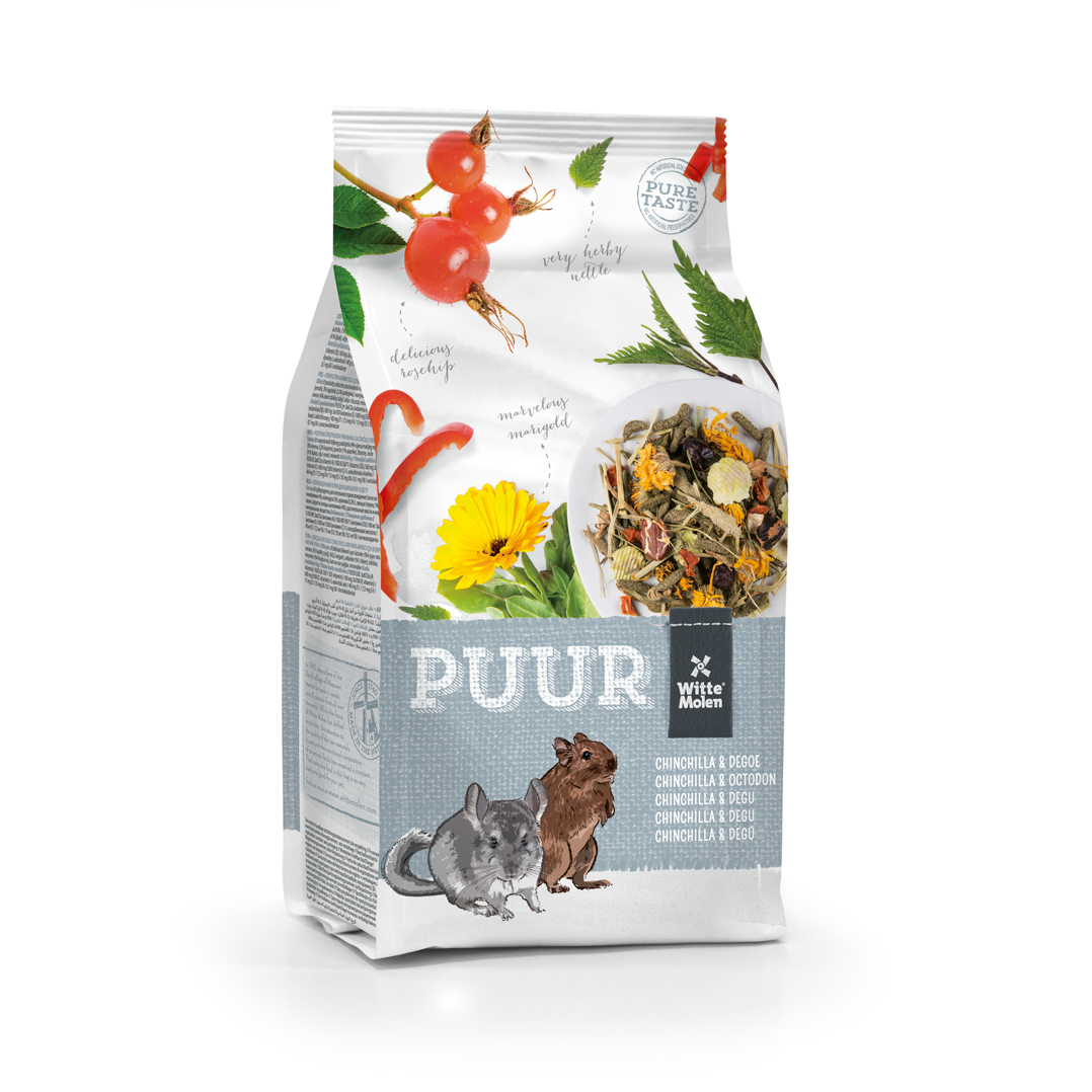 Witte Molen PUUR Chinchilla & Degu wspiera naturalne zachowania żywieniowe oraz pomaga utrzymać dobrą formę szynszyli i koszatniczek.