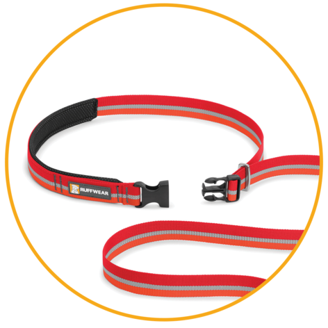Karabinek, specjalnie zaprojektowany przez Ruffwear, zapewnia mocne i bezpieczne zapięcie psa do smyczy. Rękojeść jest wyściełany dla wygody, a wygodna podwójna taśma, tworząca pętlę, umożliwia zaczepienie worków na odchody lub innych małych akcesoriów za pomocą klipsów. Odblaskowe przeszycia zapewniają widoczność człowieka i psa w warunkach słabego oświetlenia.