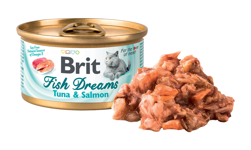 Karma uzupełniająca dla dorosłych kotów. Brit Fish Dreams to zbilansowane posiłki dla kotów. Zawiera smakowitego tuńczyka z łososiem w sosie. Wspiera witalność, zdrowie i urodę.