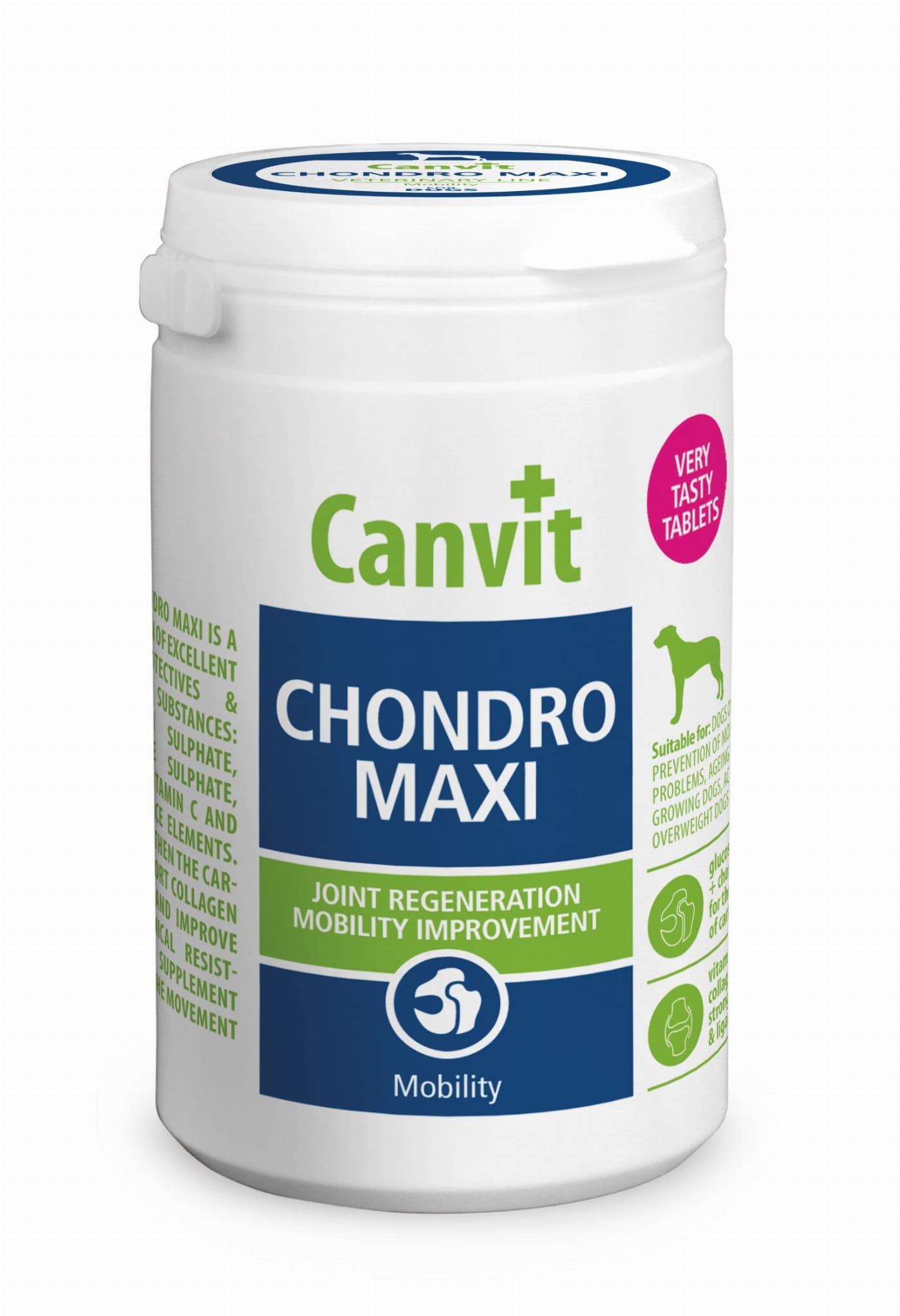 Preparat wzmacniający stawy o wyśmienitym smaku wątróbki! Canvit chondro zawiera substancje chondroprotektywne oraz bioaktywne: siarczan chondroityny, siarczan glukozaminy, kolagen, witaminę C oraz mikro i makroelementy. Wzmacniają one chrząstki, ścięgna i więzadła, wspierają wytwarzanie kolagenu.