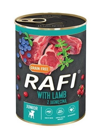Mokra karma Rafi Junior z jagnięciną to lekkostrawny produkt o wysokiej zawartości pełnowartościowego i łatwostrawnego białka, niezbędnego w prawidłowym wzroście i rozwoju szczeniąt oraz młodych psów. Mięso i surowce pochodzące z jagnięciny, oprócz pełnowartościowego białka, są cennym źródłem metioniny, izoleucyny i cystyny. Dodatkowo mokra karma Rafi Junior z jagnięciną zapewnia odpowiednie zmineralizowanie kości i zębów, co ma duże znaczenie dla szczeniąt i młodych psów. Żurawina i borówka wzbogacają codzienną dietę psa o substancje przeciwutleniające i przeciwzapalne, a tymianek stymuluje wydzielanie soków trawiennych.