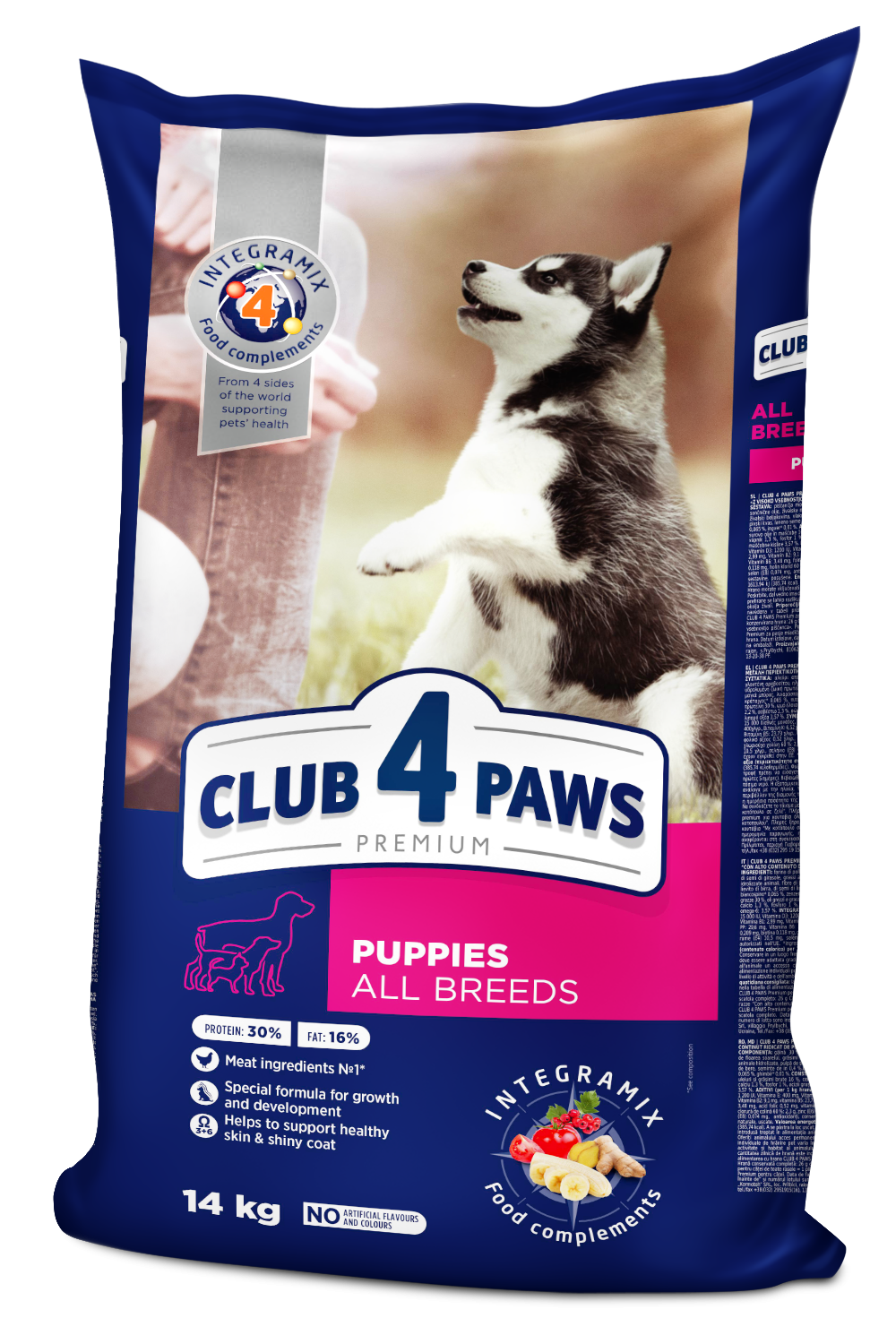 Pełnoporcjowa sucha karma premium dla szczeniąt wszystkich ras zawiera w swoim składzie na pierwszym miejscu składniki mięsne i specjalną formułę wzrostu z wysoką zawartością kurczaka (30%) dla zdrowego wzrostu w okresie pierwszych 12 miesięcy życia. Karma jest wzbogacona w kompleks Omega 3 + Omega 6 utrzymujący zdrową skórę i błyszczącą sierść i w formułę ІNTEGRAMIX dla ogólnego wsparcia zdrowia ulubieńca.