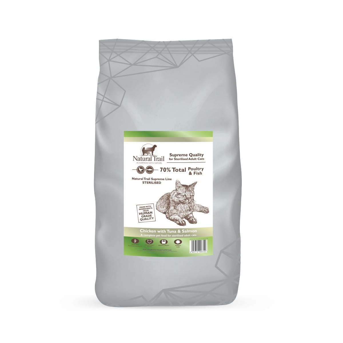 Natural Trail SUPREME STERILISED Poultry & Fish to pełnoporcjowa karma dla dorosłych kotów, zawiera dodatki które, dbają o zdrowie dróg moczowych, serce i układ trawienny, a także wspierające eliminacje kul włosowych i dbają o utrzymanie prawidłowej wagi.
