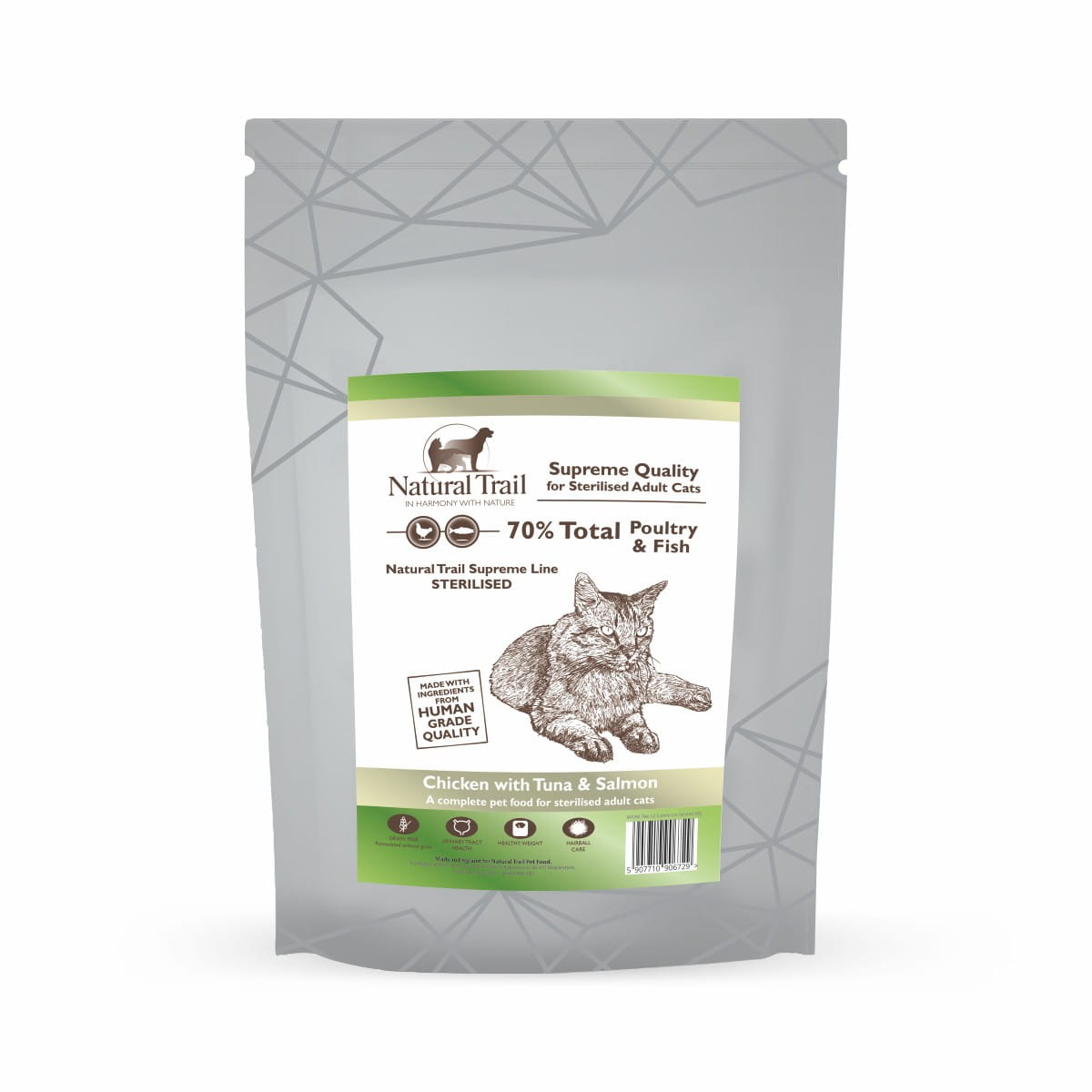 Natural Trail SUPREME STERILISED Poultry & Fish to pełnoporcjowa karma dla dorosłych kotów, zawiera dodatki które, dbają o zdrowie dróg moczowych, serce i układ trawienny, a także wspierające eliminacje kul włosowych i dbają o utrzymanie prawidłowej wagi.