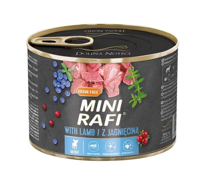 Pełnoporcjowa karma dla dorosłych psów małych ras – czyli taka, która zaspokaja wszystkie potrzeby żywieniowe danego gatunku, nie wymaga suplementacji. W jej składzie znajdują się wartościowe składniki odżywcze z surowców pochodzenia zwierzęcego. Skład karmy został przystosowany do specyficznych wymagań żywieniowych psów dorosłych małych ras, a jego wysoka przyswajalność zapewnia uzyskanie odpowiedniego poziomu białka, energii i kwasów tłuszczowych przyswajanych z pokarmu. Zawartość oleju z łososia, który jest naturalnym źródłem kwasów z rodziny n-3, jak również dodatek do karmy borówki amerykańskiej i żurawiny, oprócz dostarczenia składników odżywczych, zapewnia odpowiednie dostosowanie składników do szybkiego metabolizmu dorosłych psów. Ponadto dodatek ziół, takich jak tymianek, wpływa na poprawę funkcji trawiennych delikatnego przewodu pokarmowego dorosłych psów ras małych. Zawartość mięsna karmy – 65% - w tym jagnięciny, dostarcza odpowiednią ilość białka i kwasów tłuszczowych dla układu trawiennego psa. Spożywanie jagnięciny zapobiega chorobom układu krążenia, a także korzystnie wpływa na układ nerwowy, poprawiając refleks i aktywność. Karma Mini Rafi to idealny wybór dobrze zbilansowanej i różnorodnej diety – dla zdrowia oraz odpowiedniego żywienia Twojego psa.