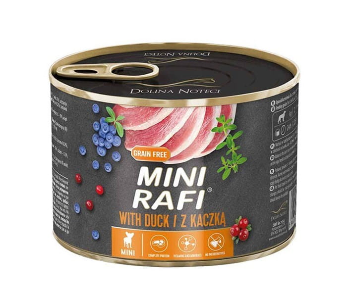 Pełnoporcjowy posiłek dla dorosłych psów małych ras, w którego składzie znajdują się wartościowe składniki odżywcze pochodzące z surowców pochodzenia zwierzęcego. Receptura karmy została opracowana tak, aby spełniać wszystkie normy dla specyficznych wymagań żywieniowych dorosłych psów małych ras. Aby zapewnić organizmowi zwierzęcia odpowiedni poziom białka i kwasów tłuszczowych muszą być one przyswojone z pożywienia. Naturalnym źródłem kwasów z rodziny n-3 jest olej z łososia, który dodany jako składnik karmy wraz z borówką amerykańską i żurawiną, wpływa korzystnie na metabolizm dorosłego psa. Dodatek ziół, takich jak tymianek, wpływa na poprawę funkcji trawiennych delikatnego przewodu pokarmowego dorosłych psów ras małych. Zawartość mięsna karmy – 65% - w tym kaczki, dostarcza odpowiednią ilość białka i kwasów tłuszczowych dla układu trawiennego psa. Spożywanie mięsa z kaczki wspiera funkcjonowanie układu nerwowego, a psy regularne spożywające kaczkę cieszą się lepszym refleksem i nie mają problemów z zasypianiem. Za sprawą zawartości wapnia i fosforu mięso to wzmacnia ich zęby i kości oraz chroni przed osteoporozą. Dzięki zawartości żelaza, chroni też przed anemią, a także wspomaga prawidłowe funkcjonowanie układu odpornościowego. Karma Mini Rafi to idealny i zdrowy wybór dobrze zbilansowanej, różnorodnej diety – dla zdrowia i odpowiedniego żywienia Twojego psa.