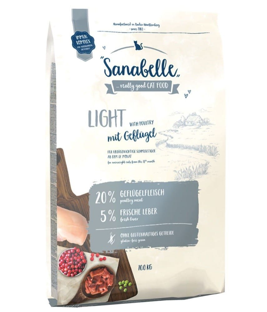 Kompletna karma sucha Sanabelle Light przeznaczona jest specjalnie dla dorosłych kotów od 12. miesiąca życia z nadwagą lub z tendencją do przybierania na wadze. Kot domowy większość swojego czasu spędza na jedzeniu i leniuchowaniu, jest mało aktywny fizycznie, przez co aktywność jego jelit spada. Może to prowadzić do nadwagi i problemów z trawieniem. Aby zminimalizować ryzyko tego typu problemów i skutecznie kontrolować wagę lub ją redukować, niezwykle istotne jest dostosowane porcjowanie pokarmu. Wartość energetyczna karmy Sanabelle Light została zredukowana, natomiast zawartość błonnika zwiększona. Dzięki temu kot szybciej poczuje się syty, a więc przyjmie mniejszą ilość pokarmu.