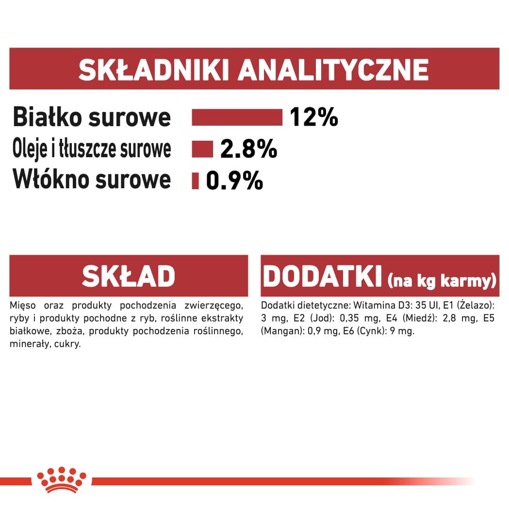 Składniki analityczne: Białko surowe: 12% - Oleje i tłuszcze surowe: 2,8% - Popiół surowy: 1,5% - Włókno surowe: 0,9% - Wilgotność: 79,5%.