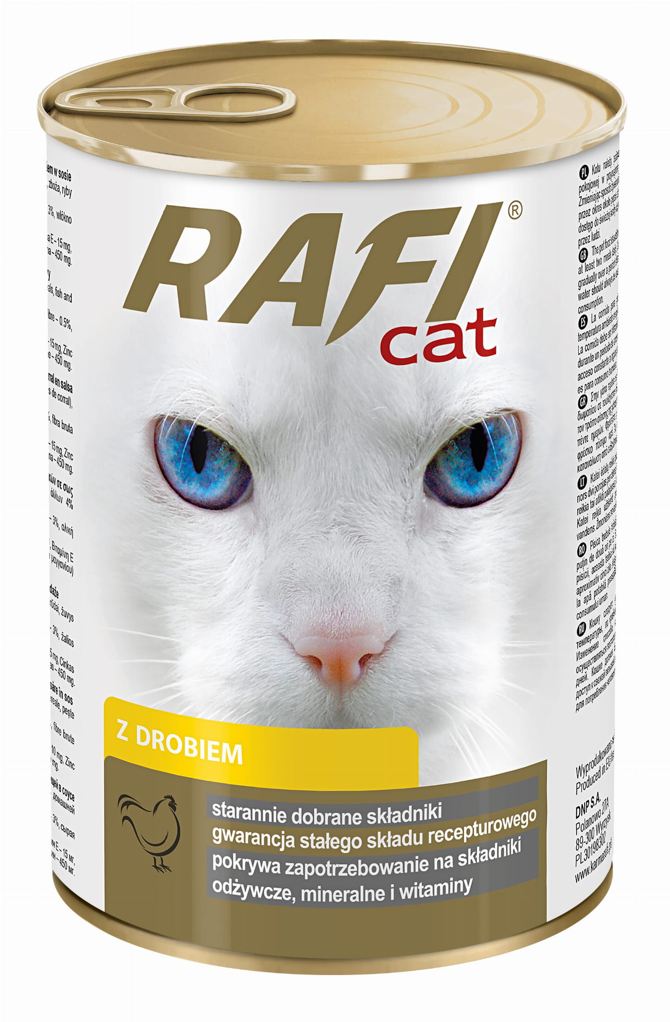 Karmy Rafi Cat to pełnoporcjowe karmy dla dorosłych kotów, które posiadają odpowiednio skomponowany skład spełniający ich wszystkie specyficzne wymagania żywieniowe. Najważniejszymi ich walorami są podstawowe surowce: mięso i produkty pochodzenia zwierzęcego oraz ryby i produkty rybne, które są źródłem wysokiej jakości białka. Karmy są produktami o optymalnej zawartości tłuszczu będącego źródłem naturalnie występującego w mięsie i produktach pochodzenia zwierzęcego kwasu arachidonowego – niezbędnego do prawidłowego funkcjonowania organizmu kotów. Dodatkowo surowce mięsne są naturalnymi źródłami kwasów z rodziny n-6, a dodatek do karm tauryny pokrywa fizjologiczną normę, dzięki czemu proces trawienia tłuszczu i białek zachodzi w sposób prawidłowy. Odpowiedni stosunek wapnia do fosforu przyczynia się do utrzymania prawidłowej homeostazy tych pierwiastków w organizmie i zachowania mineralizacji kości na stałym poziomie.