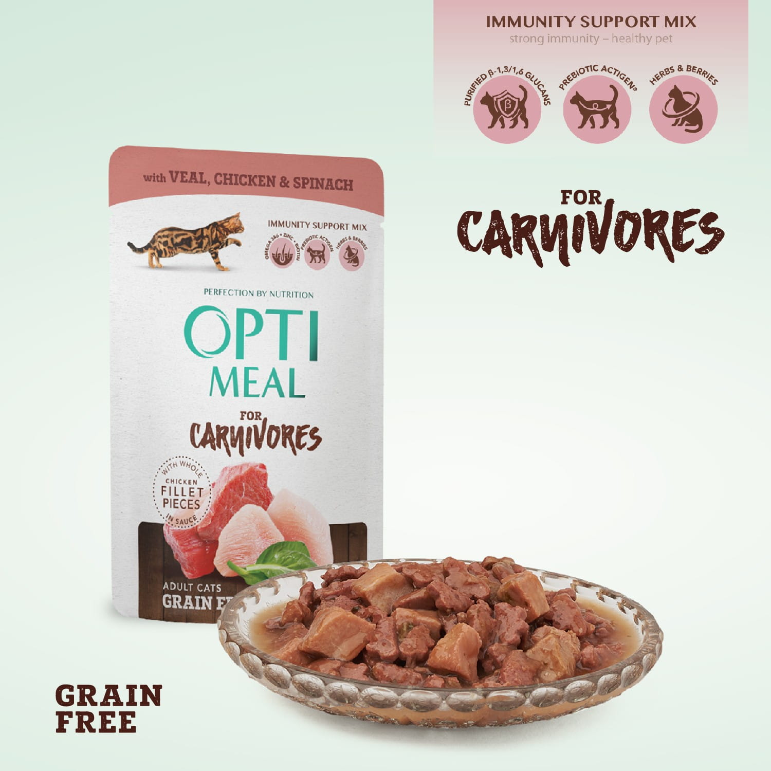 OPTIMEAL saszetka Carnivores Veal, Chicken & Spinach to bezzbożowa karma uzupełniająca dla dorosłych kotów z cielęciną, filetem z kurczaka i szpinakiem w sosie.