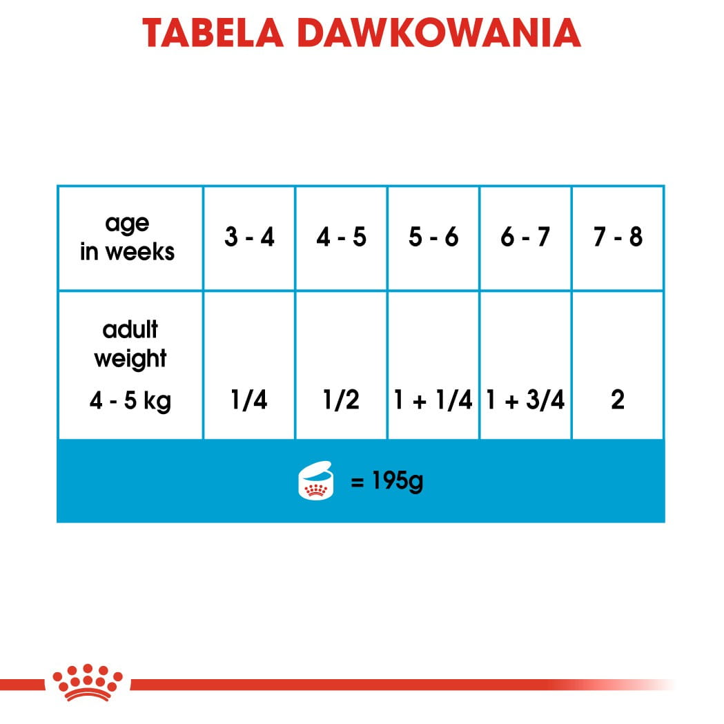 W przypadku żywienia karmą mokrą i suchą należy zapoznać się z tabelą dawkowania, aby dobrać odpowiednią porcję poszczególnych karm.