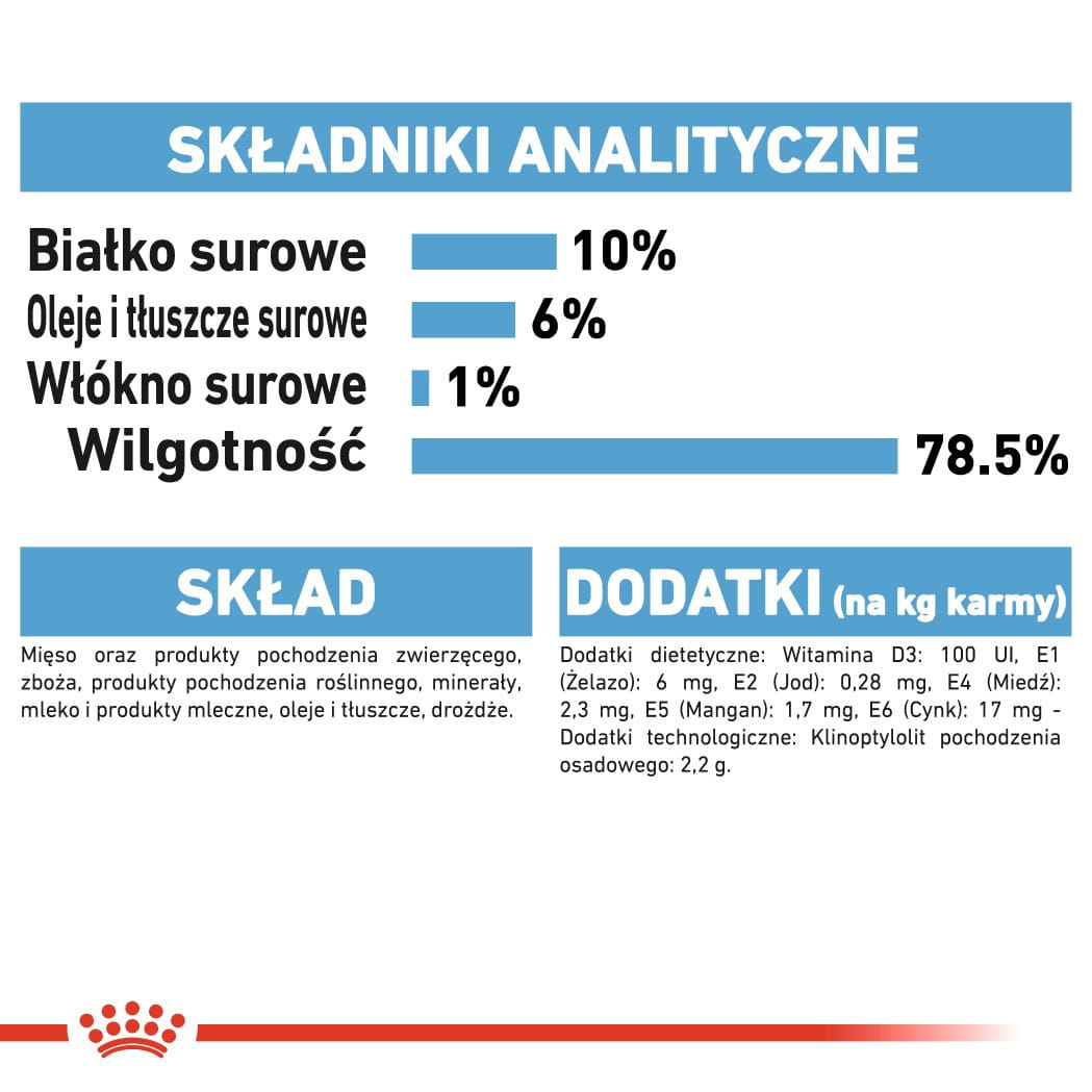 Składniki analityczne: Białko surowe: 10,0% - Oleje i tłuszcze surowe: 6,0% - Popiół surowy: 1,9% - Włókno surowe: 1,0% - Wilgotność: 78,5%.
