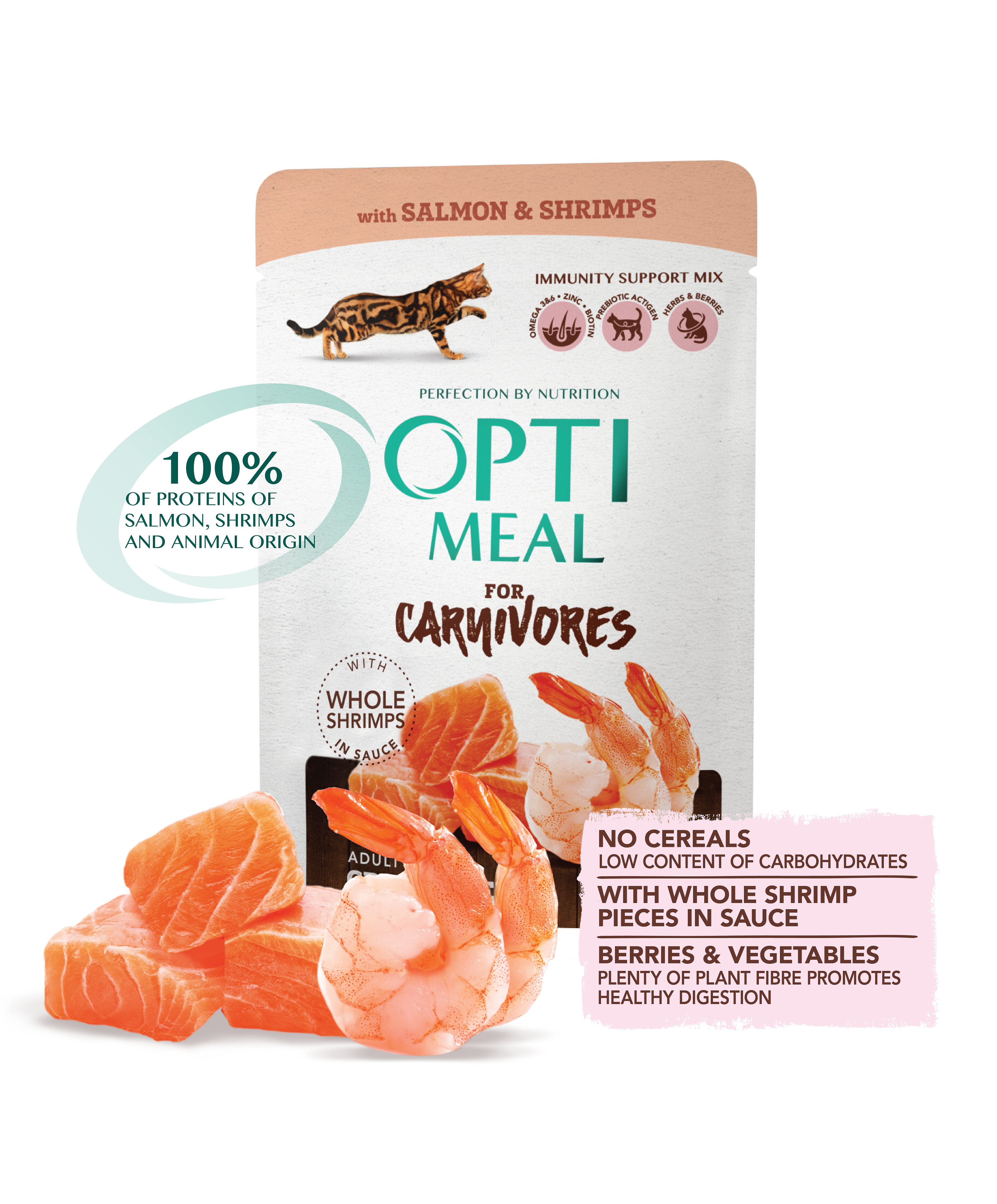 Skład: Mięso i produkty pochodzenia zwierzęcego (co najmniej 85% w kawałkach), skorupiaki (obrane krewetki 7,6%), ryby i produkty rybne (łosoś w plasterkach 9%), minerały, produkty pochodzenia roślinnego (żurawina 0,05%, nagietki (źródło luteiny) 0,01%, korzeń łopianu, korzeń prawoślazu, kwiat rumianku 0,01%, pokrzywa 0,01%, tymianek 0,01%), oleje i tłuszcze (olej z łososia, olej z ogórecznika), Actigen™ (źródło prebiotyków - mannanooligosacharydów) 0,01%, MacroGard® (źródło ß-glukan ) 0,01%.