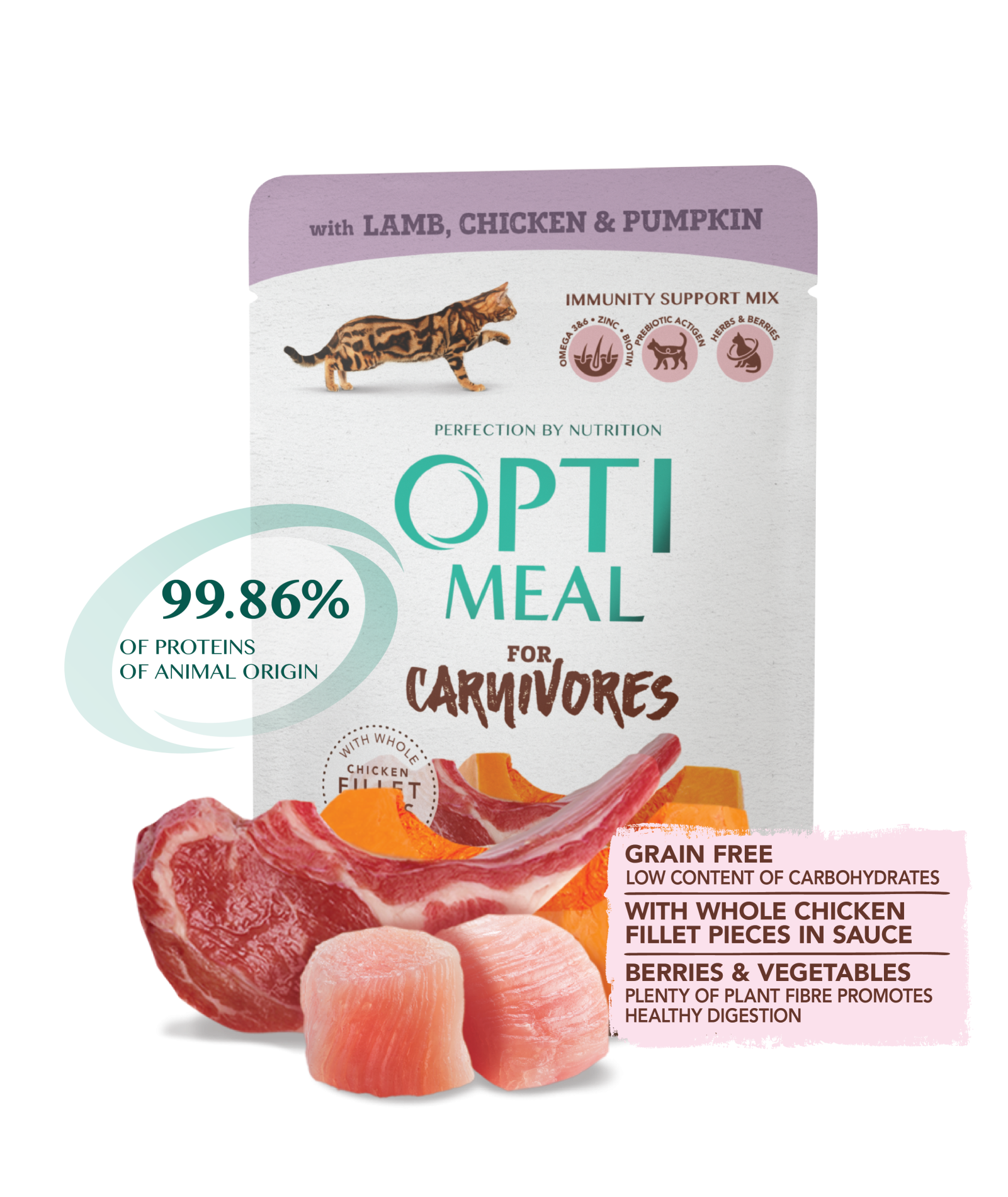 Skład: Mięso i produkty pochodzenia zwierzęcego (nie mniej niż 95% w kawałkach), w tym 17% filetów z kurczaka, 4% jagnięciny, produkty uboczne pochodzenia roślinnego (dynia 2%, żurawina 0,05%, posiłek z nagietka lekarskiego (źródło luteiny) 0, 01%, korzeń łopianu, korzeń prawoślazu lekarskiego, kwiaty rumianku 0,01%, pokrzywa 0,01%, tymianek 0,01%), minerały, oleje i tłuszcze (olej łososiowy, olej z ogórecznika), różne cukry (naturalny brązowy kolor), Actigen ™ (źródło prebiotycznych mannanoligosacharydów) 0,01%, MacroGard® (źródło ß-glukanu) 0,01%.