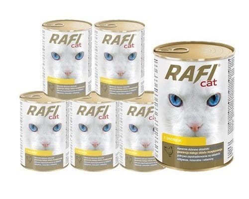 Karmy Rafi Cat to pełnoporcjowe karmy dla dorosłych kotów, które posiadają odpowiednio skomponowany skład spełniający ich wszystkie specyficzne wymagania żywieniowe. Najważniejszymi ich walorami są podstawowe surowce: mięso i produkty pochodzenia zwierzęcego oraz ryby i produkty rybne, które są źródłem wysokiej jakości białka. Karmy są produktami o optymalnej zawartości tłuszczu będącego źródłem naturalnie występującego w mięsie i produktach pochodzenia zwierzęcego kwasu arachidonowego – niezbędnego do prawidłowego funkcjonowania organizmu kotów. Dodatkowo surowce mięsne są naturalnymi źródłami kwasów z rodziny n-6, a dodatek do karm tauryny pokrywa fizjologiczną normę, dzięki czemu proces trawienia tłuszczu i białek zachodzi w sposób prawidłowy. Odpowiedni stosunek wapnia do fosforu przyczynia się do utrzymania prawidłowej homeostazy tych pierwiastków w organizmie i zachowania mineralizacji kości na stałym poziomie.
