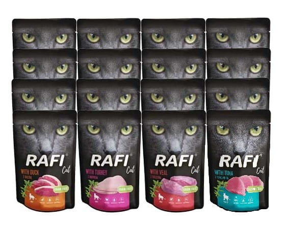 Mokra karma dla kotów zawierająca dużą ilość mięsa i produktów pochodzenia zwierzęcego oraz ryb i produktów rybnych. Posiłek Rafi Cat bazując na naturalnych potrzebach żywieniowych kotów, w pełni pokrywa zapotrzebowanie na składniki konieczne do prawidłowego funkcjonowania organizmu. Dodatkowo odpowiednio skomponowana receptura sprawia, że kot spożywa łatwostrawne, a zarazem wysokowartościowe białko, które stanowi główne źródło energii. Produkt został przygotowany przez specjalistów do spraw żywienia zwierząt i nie zawiera dodatku zbóż, konserwantów czy barwników. Dzięki temu jest on wyjątkowo apetyczny dla Twojego kota.