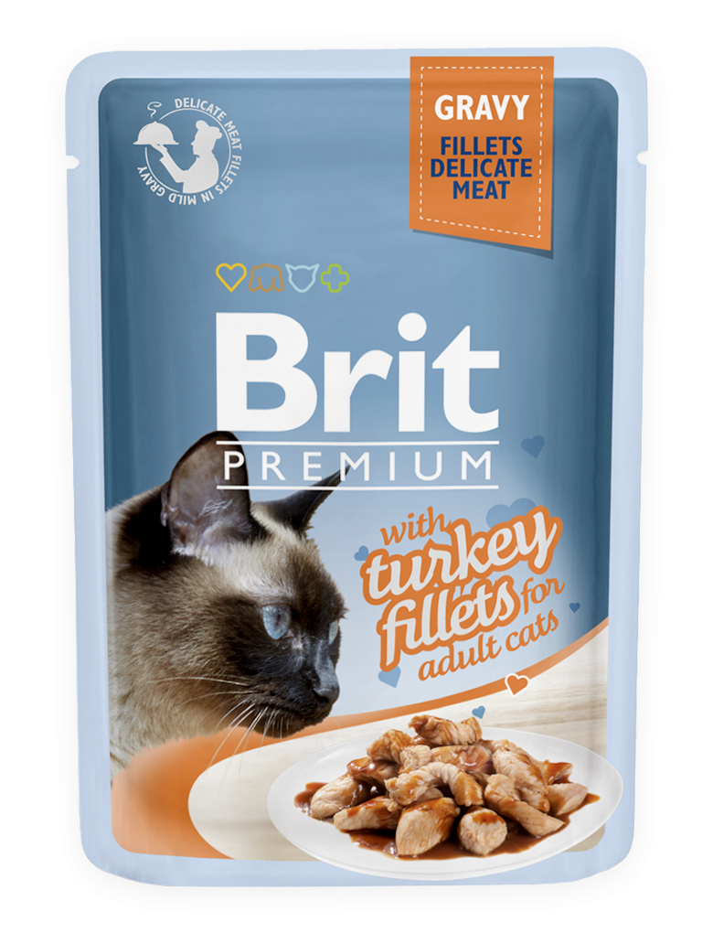Brit Premium Cat Pouch gravy fillets with turkey for adult cats. Filet z indyka w sosie. Karma pełnoporcjowa, mokra, Premium dla dorosłych kotów.