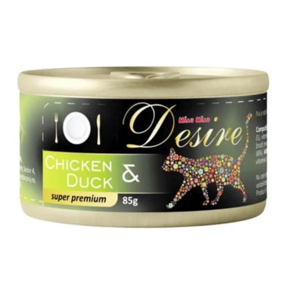 MIAU MIAU DESIRE Puszka 85g dla Kota Chicken & Duck to wyjątkowa karma, która łączy smaki delikatnego kurczaka i soczystego kaczego mięsa, zapewniając Twojemu kotu pełnowartościowy i smaczny posiłek. Dzięki starannie dobranym składnikom, karma dostarcza kotom niezbędne białko, witaminy i minerały wspierające ich zdrowie i witalność. Karma gotowana na parze, dzięki czemu zachowuje wszystkie cenne składniki odżywcze. Mięso jest ręcznie przetwarzane, co gwarantuje najwyższą jakość i smak. Puszka o pojemności 85g to wygodna forma, która pozwala na łatwe dozowanie świeżych porcji.
