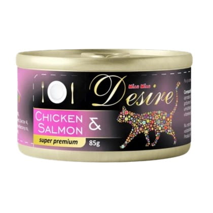 MIAU MIAU DESIRE Puszka 85g dla Kota Chicken & Salmon to superpremium karma, która łączy soczyste mięso z kurczaka z wysokiej jakości łososiem, tworząc wyjątkowy posiłek pełen smaku i wartości odżywczych. Gotowana na parze i z ręcznie selekcjonowanym mięsem, karma dostarcza Twojemu kotu wszystkich niezbędnych składników odżywczych, wspomagając jego zdrowie, witalność i błyszczącą sierść. Dzięki połączeniu kurczaka i łososia, jest to idealna opcja dla kotów, które lubią różnorodność w diecie.