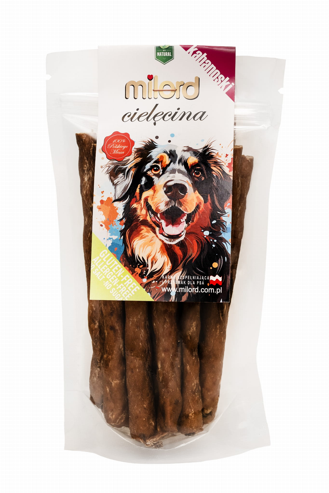 Kabanoski z cielęciny Milord to lekkostrawny i wyjątkowo delikatny smakołyk, który zadowoli nawet najbardziej wrażliwe psy. Powstają wyłącznie z mięsa mięśniowego cielęciny – bez dodatku zbóż, konserwantów czy sztucznych ulepszaczy. Dzięki temu są bezpieczne i odpowiednie dla psów wszystkich ras, w tym szczeniąt oraz psów o wrażliwym układzie pokarmowym.