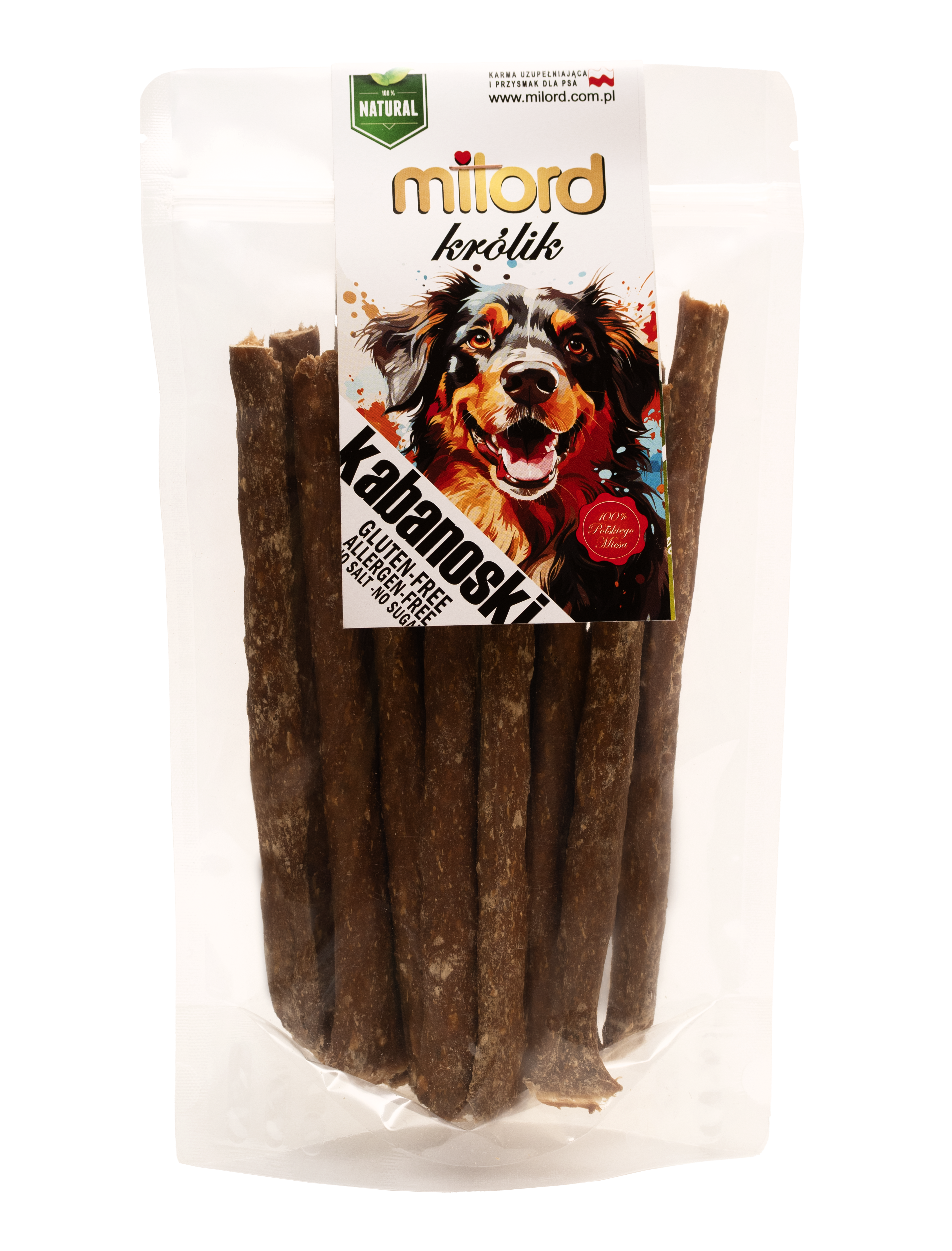 Kabanoski z królika Milord to wyjątkowo delikatna i bezpieczna przekąska, stworzona z myślą o psach wrażliwych i alergikach. Powstają w 100% z mięsa mięśniowego królika – bez zbóż, konserwantów i sztucznych dodatków. Dzięki procesowi suszenia ciepłym powietrzem w niskiej temperaturze zachowują swoje wartości odżywcze oraz naturalny smak, który psy uwielbiają.