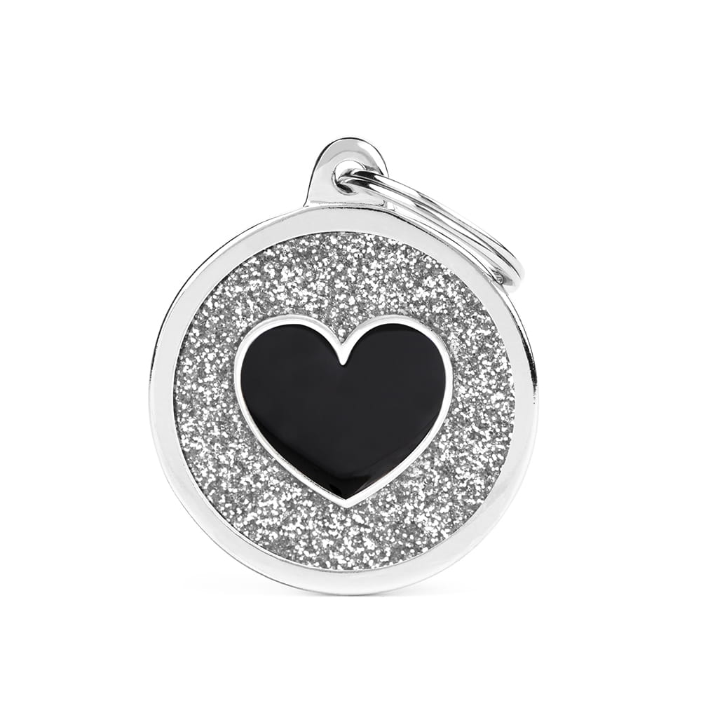 MyFamily Shine adresówka identyfikator Błyszczące szare kółko z czarnym sercem