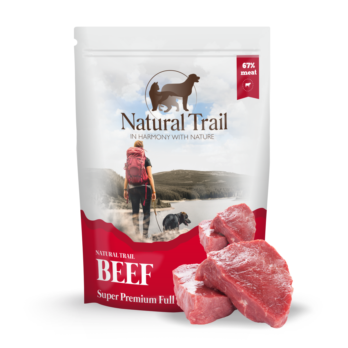 Natural Trail prezentuje wyjątkową karmę mokrą w saszetkach, stworzoną z myślą o zdrowiu i zadowoleniu Twojego pupila. Nasza monoproteinowa formuła opiera się na wołowinie - pochodzącej z serc, mięsa, wątróbek, płuc i flaków wołowych, stanowiących aż 67% składu karmy. To wyjątkowe połączenie składników odżywczych zapewnia nie tylko wyśmienity smak, ale również kompleksowe i zrównoważone odżywienie dla Twojego pupila.