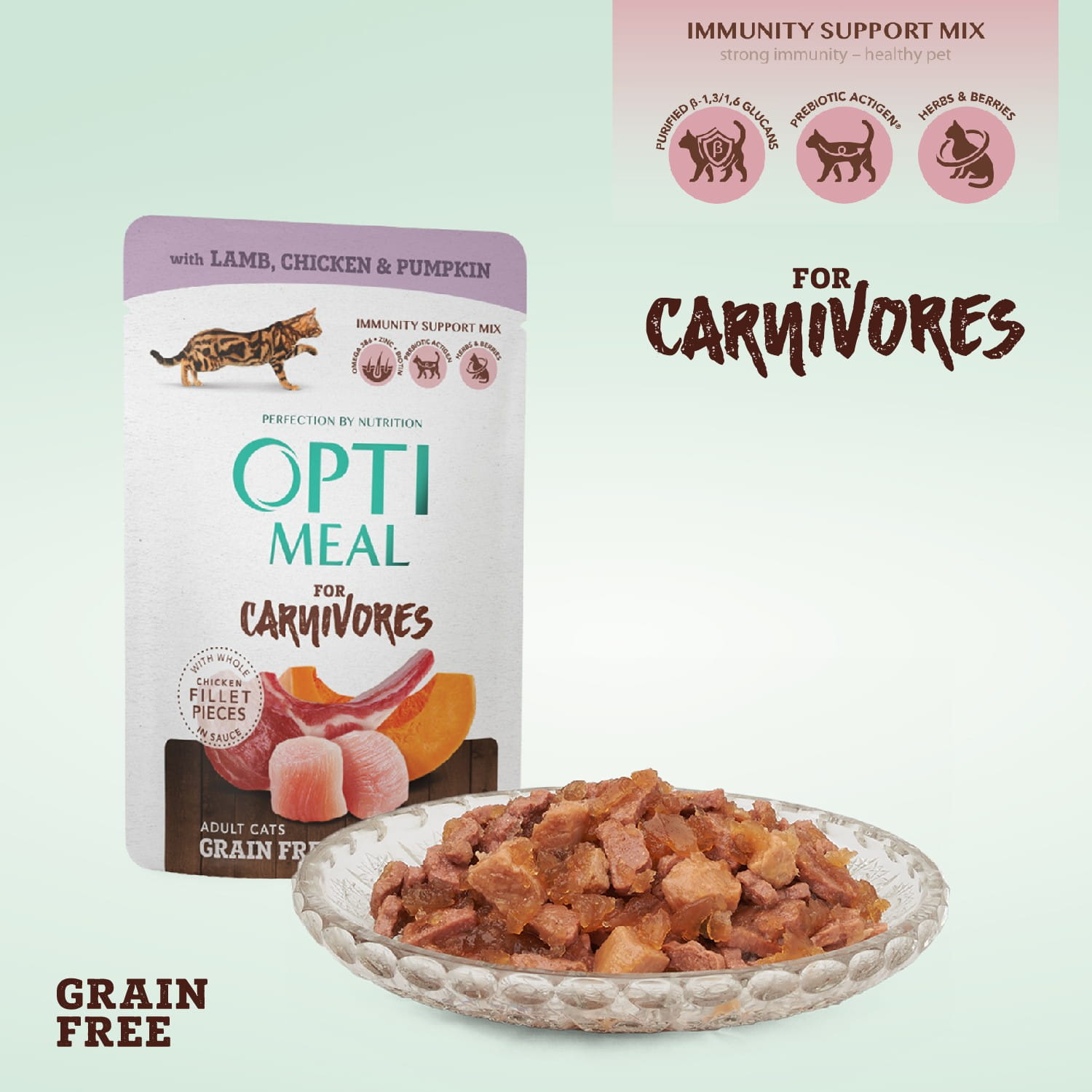 OPTIMEAL saszetka Carnivores Lamb, Chicken & Pumpkin to bezzbożowa karma uzupełniająca dla dorosłych kotów z jagnięciną, kurczakiem i dynią.