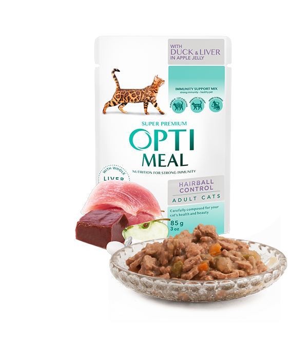 OPTIMEAL saszetka pełnoporcjowa dla dorosłych kotów, z kaczką i kawałkami wątroby w galaretce jabłkowej z efektem pozbywania się kłębków sierści. Unikalny przepis na zdrowie i urodę zwierzaka zawiera starannie wyselekcjonowane składniki mięsne, użyteczne zioła, jagody, naturalne antyoksydanty i prebiotyki. Wszystko to zapewnia codzienną, naturalną ochronę odporności Twojego kota, a także gwarantuje zdrowie i urodę Twojego zwierzaka przez wiele lat. Formuła zawiera świeże mięso z kaczki, które zapewniają Twojemu zwierzęciu wysokiej jakości, lekkostrawne białko pochodzenia zwierzęcego. Brak zbóż i glutenu pozbawi układ trawienny kota dodatkowego obciążenia, którym normalnie poddawane są jelita i trzustka w celu strawienia takich nienaturalnych składników pokarmowych dla kota, jakim jest gluten zbożowy.