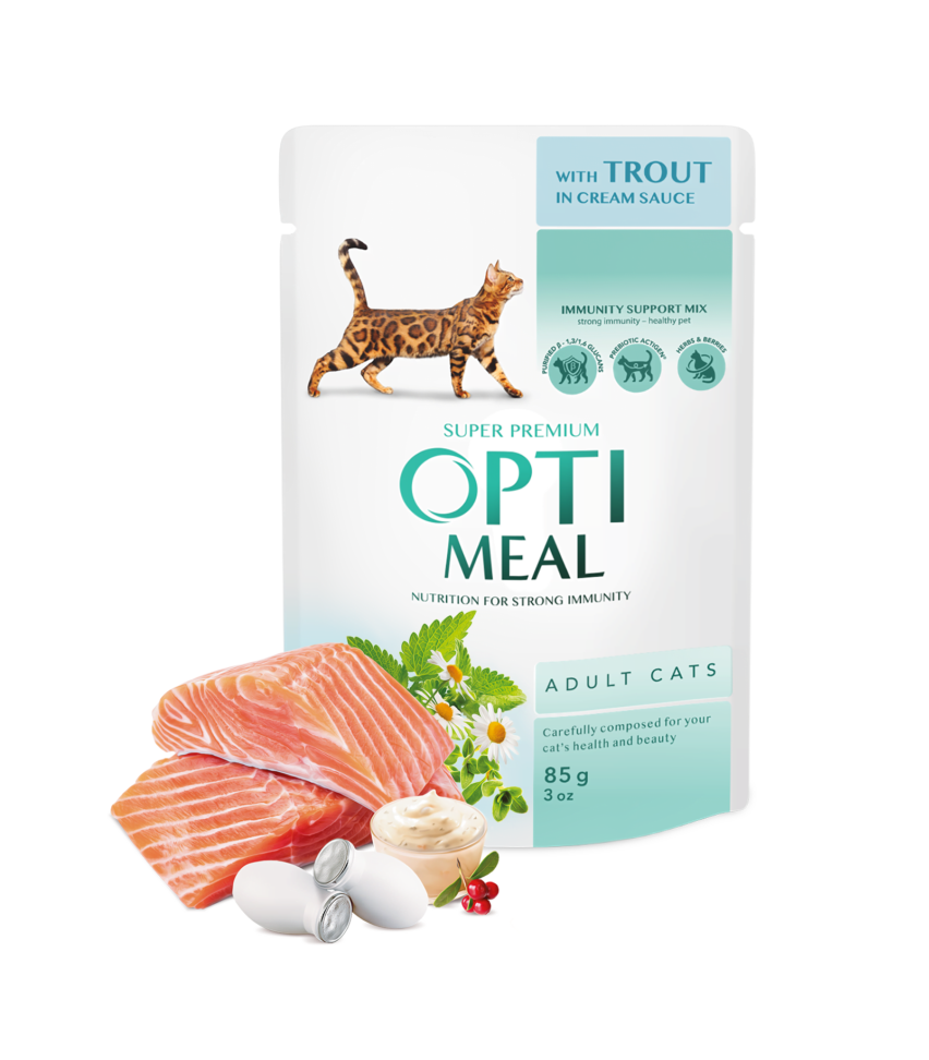 OPTIMEAL saszetka Trout in Cream Sauce to kompletna i zbilansowana karma dla dorosłych kotów od pierwszego roku życia, opracowana pod nadzorem weterynarzy. Ze względu na dużą ilość łatwo przyswajalnego mięsa z dorsza, jej smak jest bardzo atrakcyjny, nawet dla najwybredniejszych kotów. Unikalna mieszanka korzystnych ziół, jagód, wybranych składników mięsnych i prebiotyków dla zdrowia i urody tworzy codzienną naturalną ochronę odporności Twojego zwierzaka.