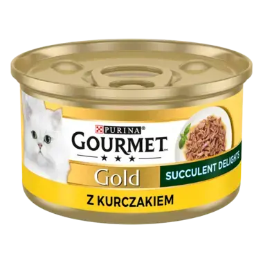GOURMET Gold Succulent Delights to wykwintna propozycja dla kotów, które cenią sobie różnorodność i doskonały smak. Każda puszka kryje w sobie soczyste kawałki mięsa lub ryb, przygotowane według wolno warzonej receptury, aby zachować pełnię aromatu i delikatną teksturę, której Twój pupil nie oprze się.