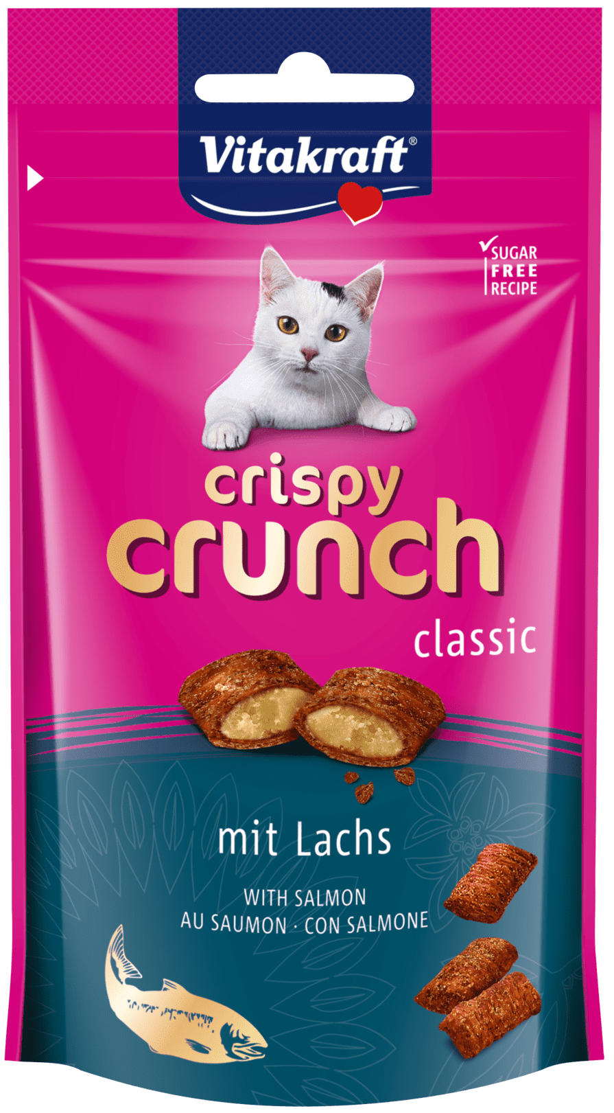 Crispy Crunch to smakowite chrupiące ciasteczka z pysznym nadzieniem. Każdy kawałek ma smakowite kremowe wypełnienie, które każdy kot pokocha. Nadzienie z suszonym łososiem sprawia, że przekąska jest jeszcze bardziej wyśmienita. Pakowane w torebeczki z zapięciem strunowym dla długotrwałego zachowania świeżości. Bez dodatku cukru.