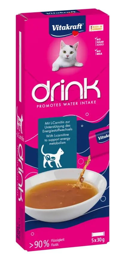 Vitakraft VITA DRINK to smakowity napój funkcjonalny dla kotów, przygotowany na bazie delikatnego bulionu z łososia. To doskonała propozycja dla kotów, które piją zbyt mało wody, potrzebują dodatkowego wsparcia odżywczego lub po prostu uwielbiają mokre, aromatyczne przekąski. Dodatek L-karnityny wspiera metabolizm i kontrolę wagi, co czyni ten produkt idealnym uzupełnieniem diety kotów mniej aktywnych lub z tendencją do nadwagi.