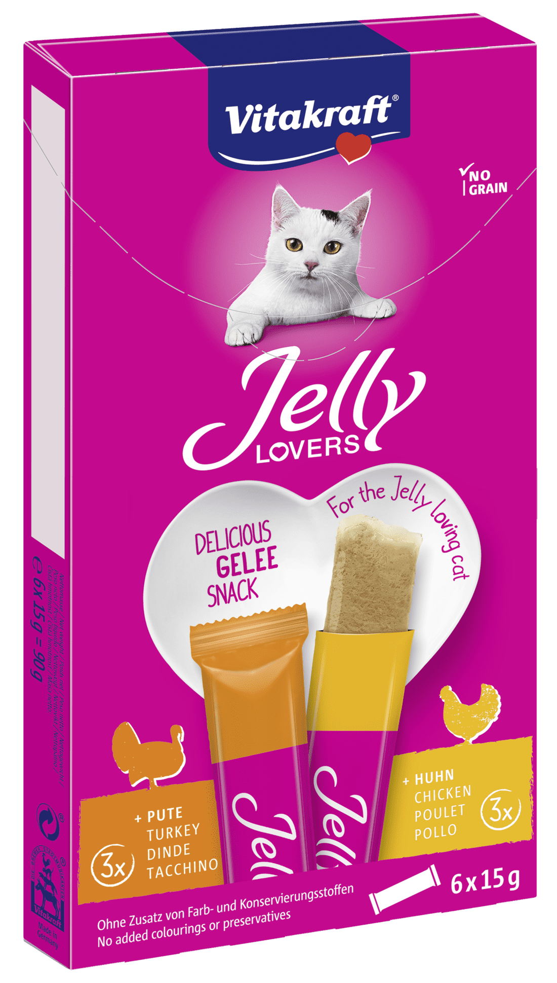 Vitakraft Jelly Lovers to karma uzupełniająca dla kotów, w postaci niskokalorycznej galaretki w dwóch smacznych wariantach. Ta niskokaloryczna przekąska produkowana jest bez dodatku sztucznych aromatów, barwników czy konserwantów, a koty uwielbiają jej wyjątkowy smak. Opakowanie zawiera sześć pojedynczych tubek. Pyszna receptura i wygoda użytkowania łączą się z zadowoleniem Twojego kota!