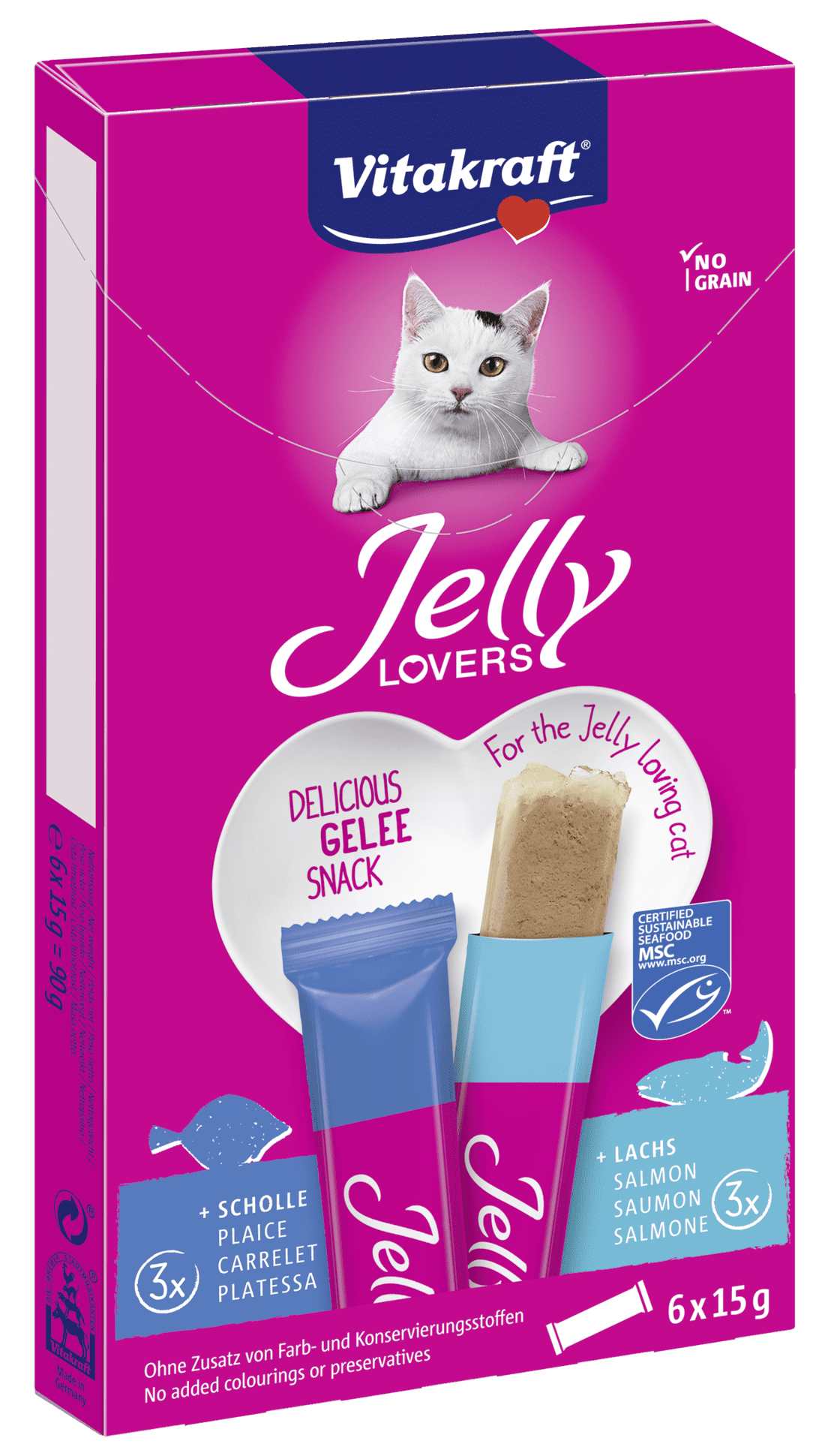 Vitakraft Jelly Lovers to karma uzupełniająca dla kotów, w postaci niskokalorycznej galaretki w dwóch smacznych wariantach. Ta niskokaloryczna przekąska produkowana jest bez dodatku sztucznych aromatów, barwników czy konserwantów, a koty uwielbiają jej wyjątkowy smak. Opakowanie zawiera sześć pojedynczych tubek. Pyszna receptura i wygoda użytkowania łączą się z zadowoleniem Twojego kota!