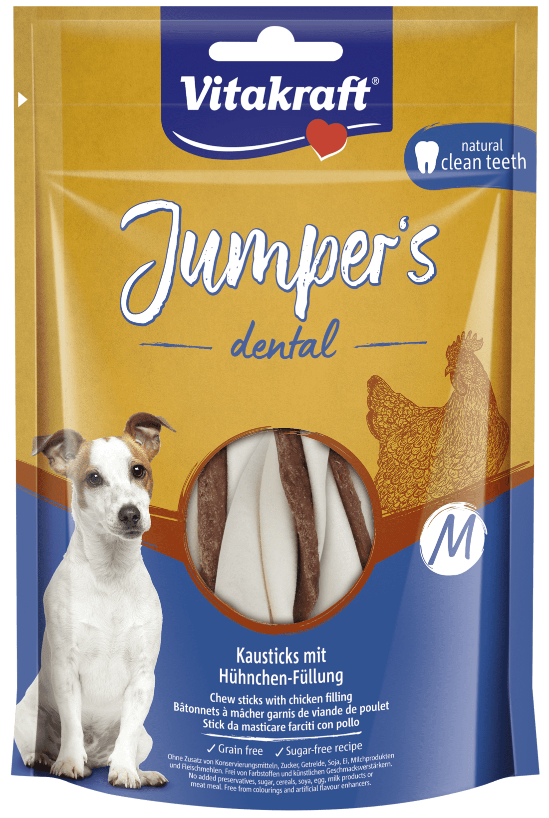 Vitakraft Jumper's dental to przysmak w formie pałeczek do żucia ze skóry wołowej do codziennej pielęgnacji zębów średnich psów. Delikatnie wypełnione pysznym mięsem kurczaka. Bez dodatku konserwantów, cukru, zbóż, soi, jajek, produktów mlecznych i mączki mięsnej. Nie zawiera barwników i sztucznych wzmacniaczy smaku. Pakowane w torebki strunowe z łatwym zamknięciem, pozwala na dłużej zachować świeżość przysmaków. Twój pies go pokocha. Opakowanie zawiera 5 sztuk przysmaku.