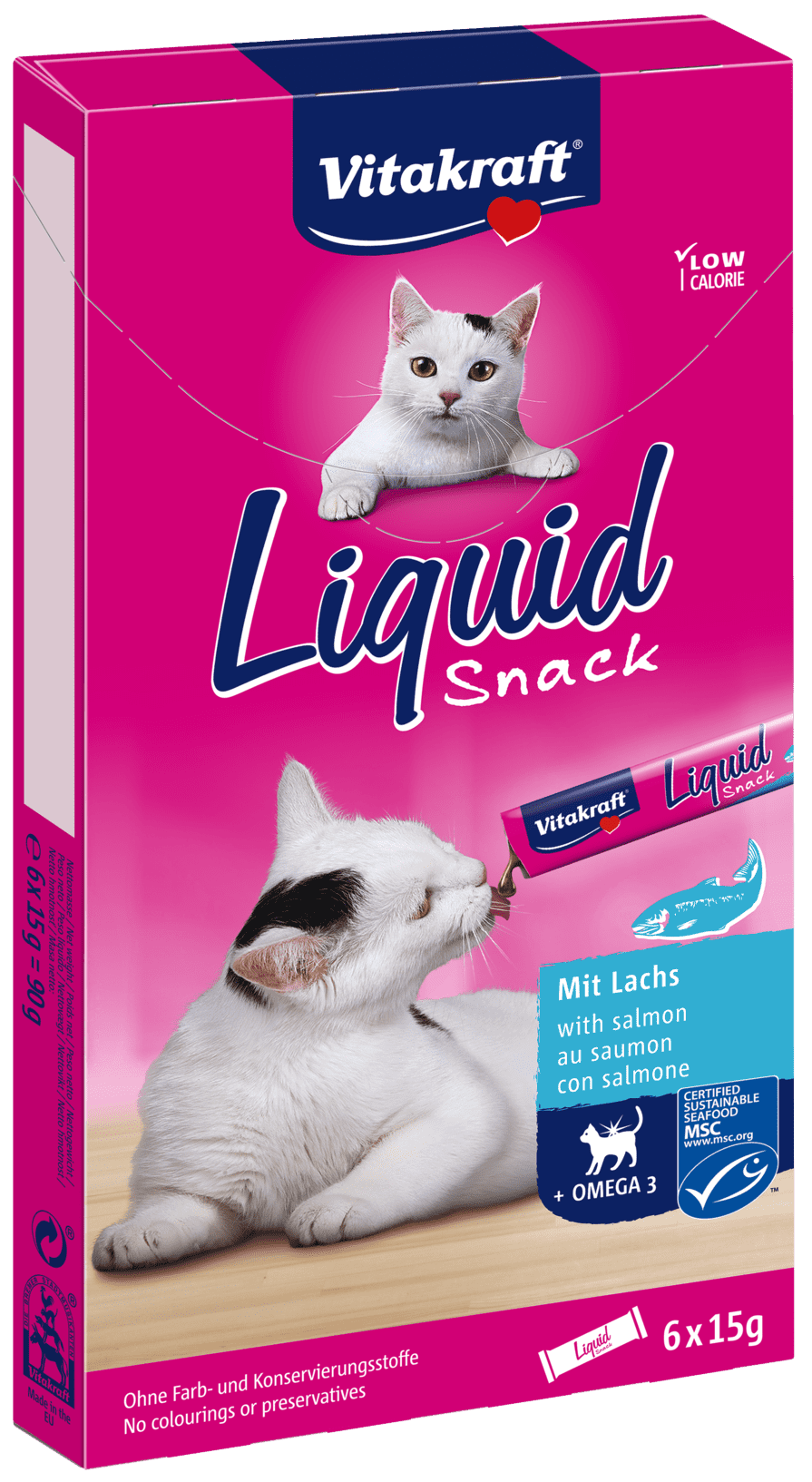 Vitakraft Cat Liquid Snack to przysmak o kremowej konsystencji, może być podawany prosto do pyszczka lub jako dodatek do normalnego posiłku, aby zachęcić kota do jedzenia. Ta niskokaloryczna przekąska produkowana jest bez dodatku sztucznych aromatów, barwników czy konserwantów, a koty uwielbiają jej wyjątkowy smak. Przysmak jest nie tylko bardzo smaczny, zawiera on również kwasy tłuszczowe omega-3, które są niezbędne dla zdrowej skóry i sierści. Opakowanie zawiera sześć pojedynczych tubek. Pyszna receptura i wygoda użytkowania łączą się z zadowoleniem Twojego kota! Dla kotów powyżej 3. miesiąca życia.