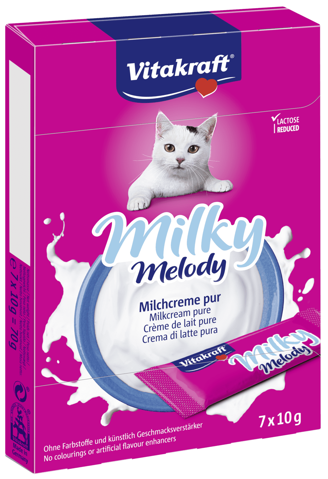 Vitakraft Cat Milk Melody to delikatny mleczny krem na wyjątkowe chwile. Każda porcja pakowana oddzielnie dla zachowania świeżości przez długi czas. Przekąska do podawania między posiłkami - bezpośrednio z opakowania lub z miseczki. Opakowanie zawiera siedem pojedynczych tubek. Pyszna receptura i wygoda użytkowania łączą się z zadowoleniem Twojego kota!