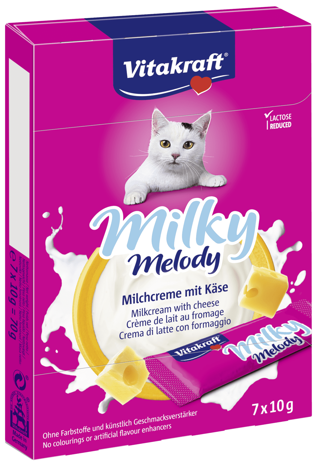 Vitakraft Cat Milk Melody to delikatny mleczny krem na wyjątkowe chwile. Każda porcja pakowana oddzielnie dla zachowania świeżości przez długi czas. Przekąska do podawania między posiłkami - bezpośrednio z opakowania lub z miseczki. Opakowanie zawiera siedem pojedynczych tubek. Pyszna receptura i wygoda użytkowania łączą się z zadowoleniem Twojego kota!