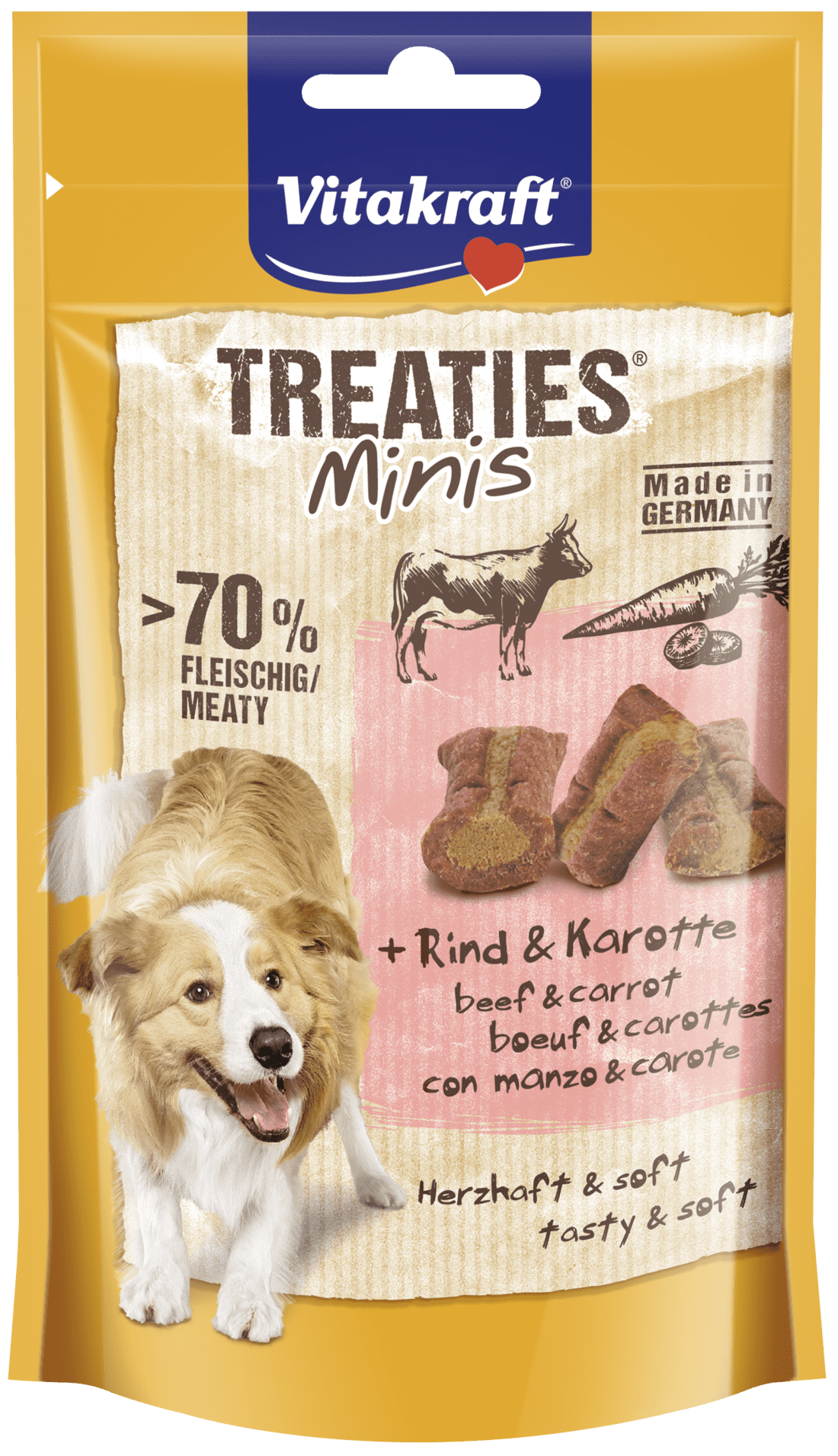 Vitakraft Treaties Minis z wołowina to karma uzupełniająca dla psów w formie pieczonych mini pasztecików, które zostały poddane specjalnemu procesowi opiekania. Nie zawiera cukru i sztucznych dodatków smakowych.