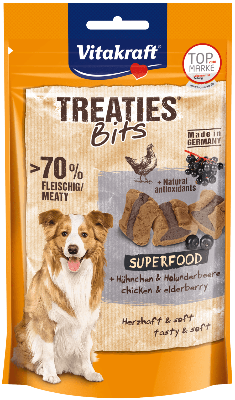 Vitakraft Treaties Bits z bzem to karma uzupełniająca dla psów w formie pieczonych mięsnych pasztecików, które zostały poddane specjalnemu procesowi opiekania. Nie zawiera cukru i sztucznych dodatków smakowych.