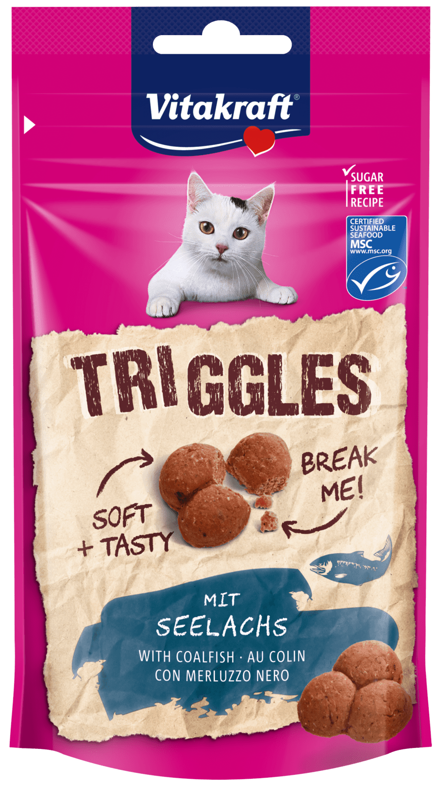 Vitakraft Triggles to pyszna, miękka przekąska dla kota. Idealna do podawania jako rozpieszczacz lub nagroda za dobre zachowanie. Każdy kawałek można łatwo podzielić na trzy mniejsze - jest to bardzo wygodne w trakcie podawania zwierzęciu. Pakowane w torebeczki z zapięciem strunowym dla długotrwałego zachowania świeżości. Bez dodatku cukru.