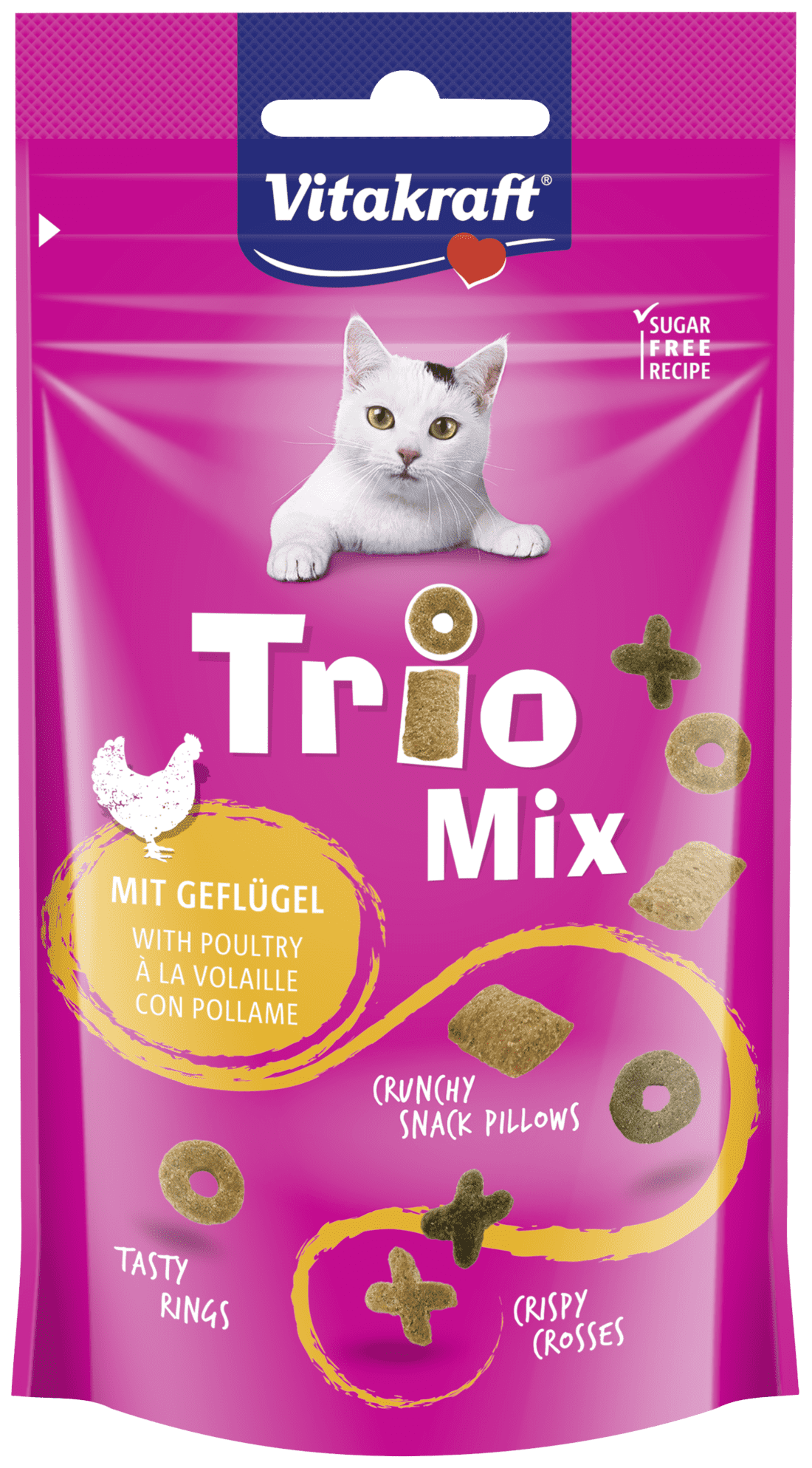 Vitakraft Trio mix to mieszanka chrupiących przysmaków w różnych kształtach. Idealne jako nagroda lub przekąska. Pakowane w torebeczki z zapięciem strunowym dla długotrwałego zachowania świeżości. Bez dodatku cukru.