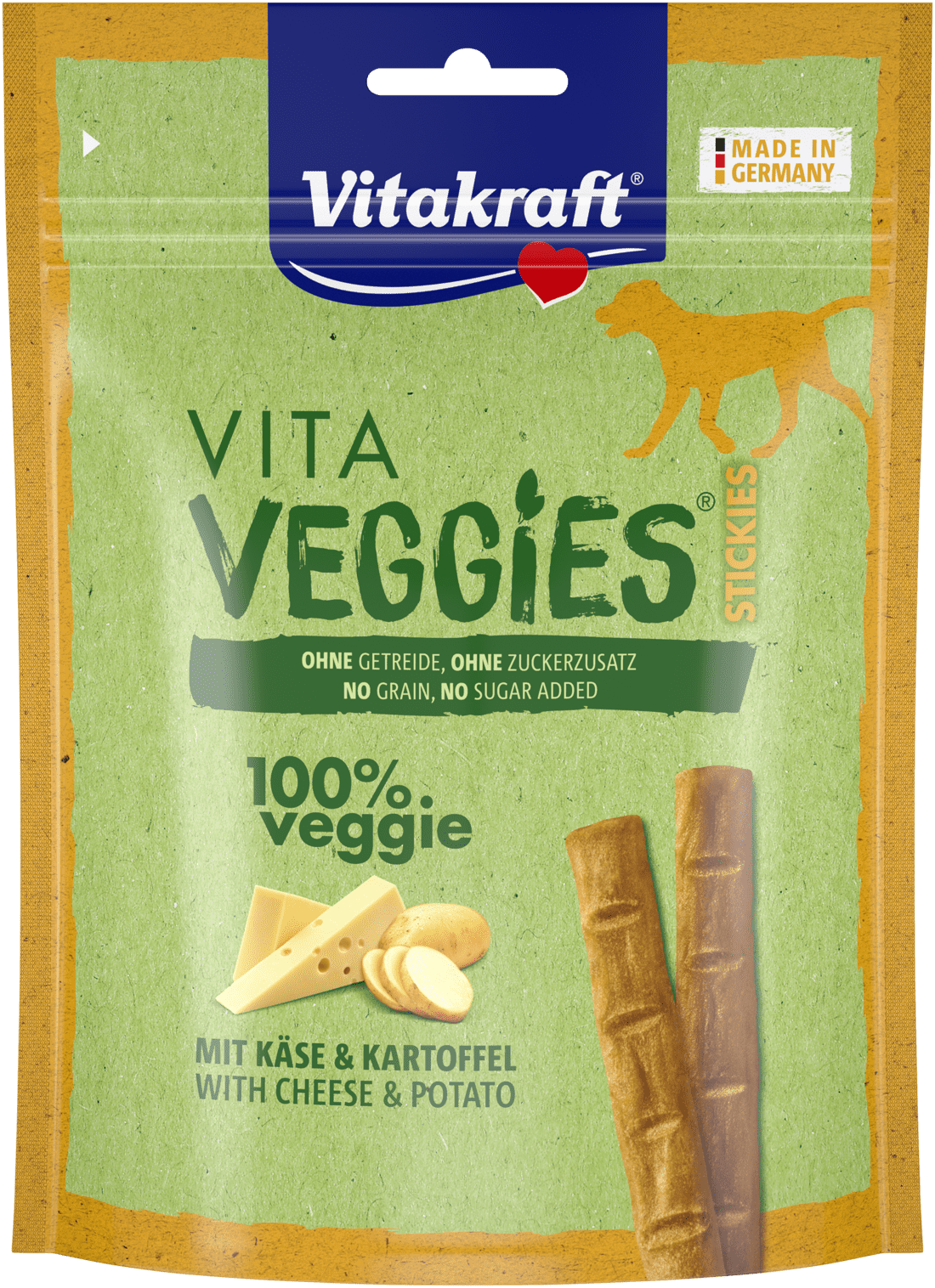 Vitakraft Stickies Vita Veggies to kabanosy z pożywnym serem i o 100% wegetariańskiej recepturze. Wegetariańskie przysmaki dla psów. Bezmięsne pałeczki bogate w zdrowe warzywa oraz cenne białko z sera. Niskotłuszczowe przekąski nie zawierają zbóż, więc mogą być podawane psom z nietolerancją na zboża. Oprócz wysokiej smakowitości, Vitakraft Vita Veggies wabią psy atrakcyjnym zapachem.
