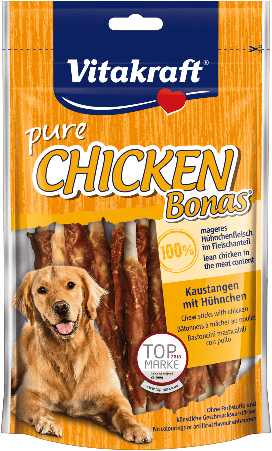 Vitakraft pure Chicken Bonas to pałeczki do żucia owinięte smacznym mięsem kurczaka. Zdrowa przekąska między posiłkami. Należy uwzględnić podaną ilość przysmaku w codziennym menu psa. Bez dodatku cukru, zbóż, soi, jajek, produktów mlecznych i mączki mięsnej. Nie zawiera barwników i sztucznych wzmacniaczy smaku. Pakowane w torebki strunowe z łatwym zamknięciem, pozwala na dłużej zachować świeżość przysmaków.