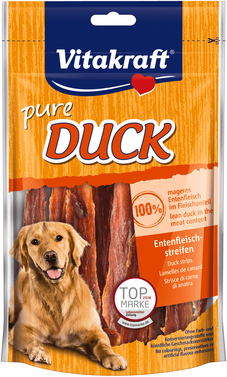 Vitakraft pure Duck to plastry mięsa z kaczki, przygotowane ze świeżego, delikatnego mięsa. Zdrowa przekąska między posiłkami. Należy uwzględnić podaną ilość przysmaku w codziennym menu psa. Bez dodatku cukru, zbóż, soi, jajek, produktów mlecznych i mączki mięsnej. Nie zawiera barwników i sztucznych wzmacniaczy smaku. Pakowane w torebki strunowe z łatwym zamknięciem, pozwala na dłużej zachować świeżość przysmaków.