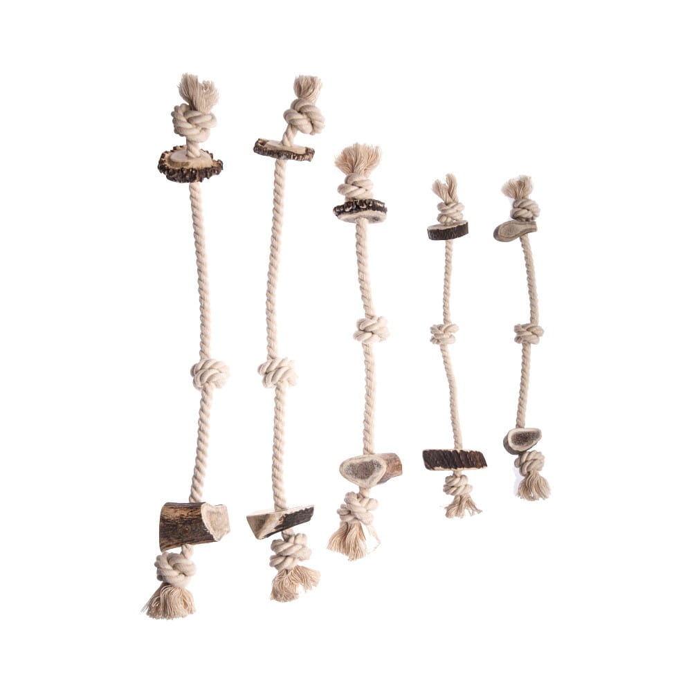 Długa na 30-50 cm zabawka z bawełnianą liną o średnicy 10-12 mm. Sznur z dwóch stron zakończony węzłami i porożem. Gryzak wykonany ręcznie z naturalnie gubionych, przeciętych wzdłuż, poroży jelenia, daniela i łosia. Poroża przecięte wzdłuż mają odsłonięte gąbczaste wnętrze rogów, dzięki czemu łatwiej je gryźć psom o słabszych szczękach. Dodatkowo pod wpływem śliny ulega ono zmiękczeniu i staje się łatwo dostępne dla psa. Poroże wspomagają czyszczenie zębów, pozytywnie wpływają na przemianę materii, krążenie krwi, strukturę kości, mięśni i stawów oraz układ odpornościowy. Nie zawierają sztucznych dodatków. Nie pozostawiają śladów ani nie posiadają zapachu. Gryzak nie jest odpowiedni dla szczeniąt młodszych niż 8 miesięcy ani dla psów seniorów (ryzyko uszkodzenia zębów). Produkt ze zrzutów zebranych w polskich lasach.